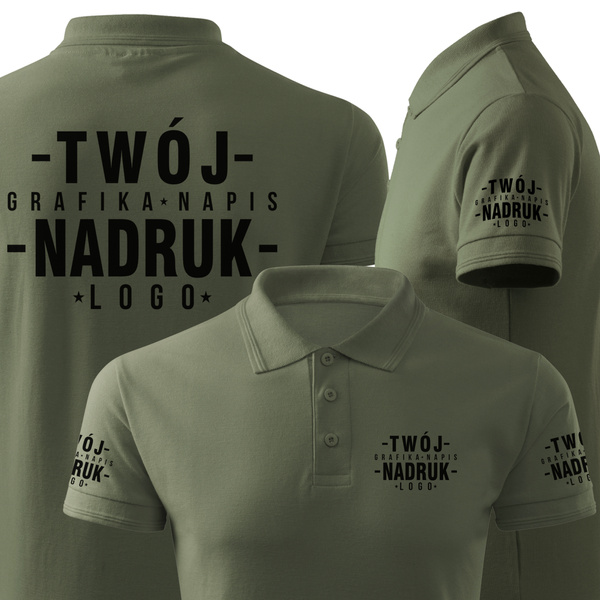 • Męska koszulka polo w kolorze khaki z indywidualnym nadrukiem umieszczonym na piersi, plecach i obu rękawkach. Doskonale sprawdzi się jak i jako element odzieży firmowej, reklamowej lub jako personalizowany prezent dla bliskiej osoby.